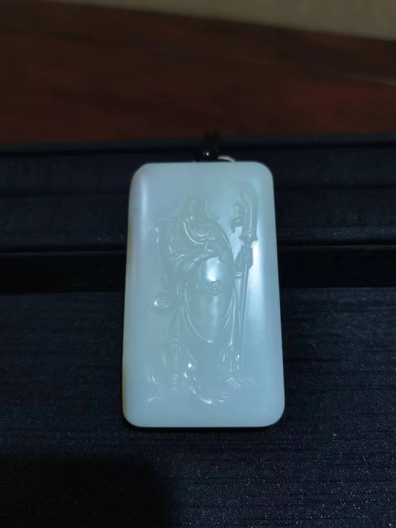 此款关公牌羊脂白玉,质地油润细腻,白皙无暇,侧面沁色,毛孔可见,无论质地抑或雕工皆为上品,乃集赏、玩、藏、传世之精极品。